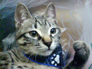可愛いバンダナを巻いてもらったけど自力で外してしもうたわ。