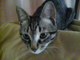 キャットタワーでボヤ~としていても、狙いを見つけるやハンターの表情に豹変。