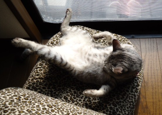太陽の光を浴びてニャンコもパカっと開放スタイル。