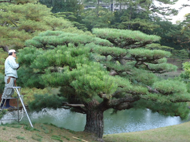 栗林公園では珍しい剪定途中の松の枝のビフォーアフターを見つけました。