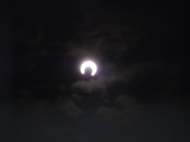 空に浮かぶ小さな金のリングは日食メガネを通して撮るしかない。