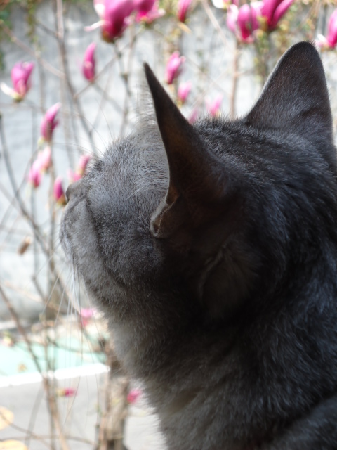 春♪燦燦♪もくれんの花を愛でる猫。
