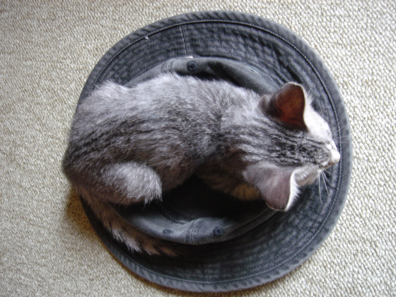帽子の上に乗かってみたり、丸まってみたり、帽子と同化するニャンコ。